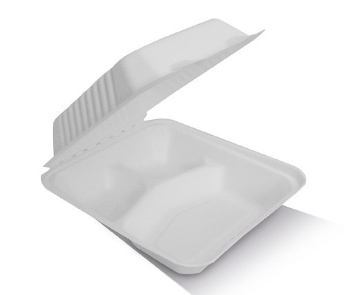 8” Sugarcane Small Dinner 3 Compartment Clamshell White 203 x 203 x 58mm 200 (4x50pcs)