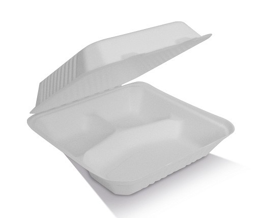 9” Sugarcane Large Dinner 3 Compartment Clamshell White 229 x 229 x 80mm 200 (2x100pcs)