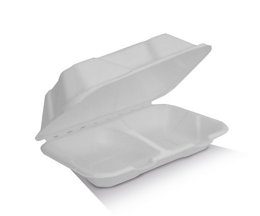 9.7 x 6.5 x 3” Sugarcane Snack 2 Compartment Clamshell White 251 x 163 x 71mm 250 (2x125pcs)
